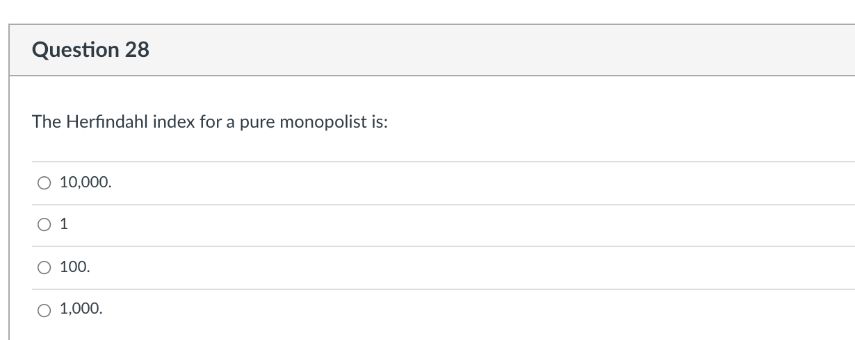 B) is less than the herfindahl index. The herfindahl index for a pure monopolist is: D) is 15 percent or more.